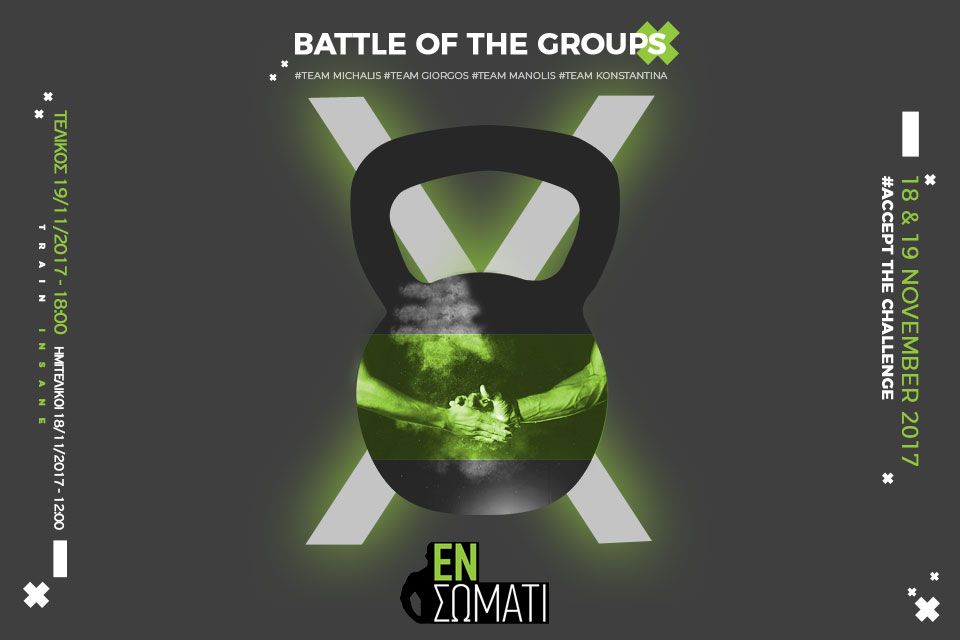 Battle of the groups... 4 trainers #TeamMichalis #TeamGiorgos #TeamManolis #TeamKonstantina με 2 ομάδες ανδρών – γυναικών ο καθένας των 3 αθλητών!!! Η μάχη των ομάδων έρχεται στην αρένα του Εν Σώματι το Σάββατο 18/11 στις 12:00 (Ημιτελικοί) και την Κυριακή 19/11 στις 18:00 (Τελικός) με νικητή μόνο έναν!!!